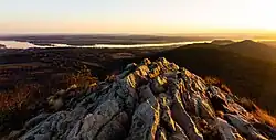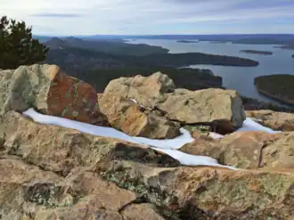 Quarrying for sandstone and shale within the modern park began in about 1920.[2] The eastern slope of Pinnacle Mountain was a major source of material for the construction of the Lake Maumelle dam in the 1950s.[2] Located immediately northwest of Pinnacle Mountain, Lake Maumelle is a high-quality raw water supply serving a population of almost 398,000; the reservoir went online in 1958, at least two years after the Big Maumelle River was impounded.[3] In the 1960s, extensive quarrying of sandstone took place at the modern visitor center, the result of which can be seen by the quarry pond.[2]