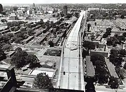 Aerial view of Interstate 81 cutting through the neighbourhood, still partly under construction, 1967