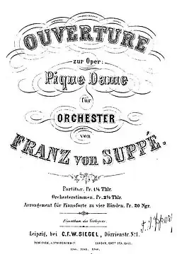 Pique Dame (The Queen of Spades) is an operetta in two acts by Franz von Suppé to a German-language libretto very loosely based on Alexander Pushkin's 1834 short story "The Queen of Spades". The author of the libretto is S. Strasser (probably Suppé's second wife Sofie Strasser).[1] Pique Dame was a revised version of Suppé's 1862 operetta Die Kartenschlägerin ("The Fortune Teller") and premiered in June 1864 at the Thalia Theater in Graz. The work is primarily known today for its overture which remains a popular concert piece.