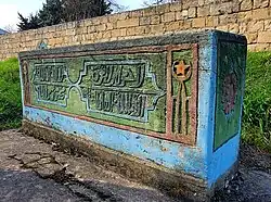 There is an ancient cemetery, caravanserai complex around the khanqah. An inscription on the facade of the monument, written in the Arabic written in thuluth script with kufic element, says: "In the Name of Allah, the merciful and the gracious. This is the grave of the Sheikh, the Imam, the greatest scientist, the believer, Tair Taj Al-Huda Mardakani Ibn Ali. May Allah have mercy upon them...." [1]