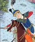 Tabari says that Sarm and Tuj ruled the earth for 300 years after they had killed their brother.[107] Manushihr, a descendant of Iraj,[108] becomes king and avenges Iraj's murder, by killing Sarm and Tuj. Manushihr's rule was "described as just and generous".[107] Towards the end of his reign, he is attacked by Frasiyab, king of Turan (that is of the Turks) and a descendant of Tuj. An agreement is made whereby the boundary between their realms is set by having an Iranian archer shoot an arrow from a mountain and where it lands will form the frontier. The arrow landed near Balkh at the Oxus river, which becomes the boundary between the Iranians and the Turks.[109]