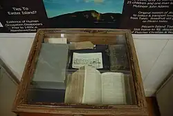 The museum contains ancient artefacts such as stone tools, which were made by Polynesians who lived on the island prior to the arrival of the mutineers.[4] In 1998 archaeologists from James Cook University excavated the wreck of HMS Bounty.[5] Artefacts from the wreck, such as the cannon were conserved at the Queensland Museum before returning to Pitcairn for display.[5] The collection includes other objects, including a wheelbarrow, a Bible thought to be from the Bounty, and various books and articles about the history of Pitcairn Island.[4][6] The collection also includes archival items, such as letters written to family members on Pitcairn from those living on Norfolk Island.[2] Archival research on Pitcairn demonstrated that there had been dispute other ownership of artefacts in the museum, as well as whether they should be in a "museum".[3]