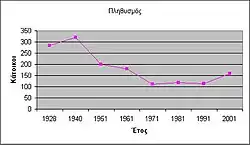 Urbanization, influenced Pitsiota as it did in all Greek villages in the 1960s according to the upper data. The present population of the village consists almost wholly of aged people, above 70 years old. The Winters Pitsiota is emptying, and its only inhabitants are about 8-10 aged couples. However, in the summer the population can reach 200 of all ages. Official data of 2001 showed also that average in Pitsiota stays at "37 women and 38 men".