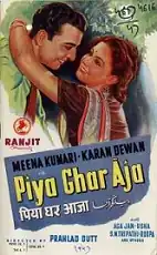 Piya Ghar Aaja is an Indian film directed by Prahlad Dutt and starring Meena Kumari, Karan Dewan, Saroj, Agha Jaan and Mohantara Talpade.[1] Meena Kumari also lent her voice for playback and sang seven songs in this film.[2] The film was released on 23 April 1948. Incidentally, the film's original title was "Jalan".