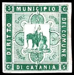 At the end of 1873, Torres sent the municipality of Catania proofs of a set of revenue stamps that he had prepared for their use. They show an elephant as appears in the coat of arms of the municipality.[11] Torres and his collaborators began to sell the stamps to collectors without waiting for the municipality to approve them,[11] and when Le Timbre Fiscal revealed in Spring 1874[12] that the stamps were not approved, he was obliged to offer to buy back those he had sold in advance.[11] The main distribution of the stamps, however, had been by Bonasi and his wife, and they were not disposed to refund anyone. There was also the additional fraudulent sales of fakes by Bonasi in Italy and elsewhere. In the ensuing scandal, Torres relocated his shop and cancelled the next issue of his magazine.[11] Finally, in an attempt to clear his name,[11] he published a pamphlet I Moderni Cagliostri od i conti A. Candrini e G.C. Coniugi Bonasi[13] (A Modern Cagliostro), condemning the activities of Bonasi and his wife which brought an end to his relationship with them and Usigli. At the end of 1874, Torres returned to Spain.[11]