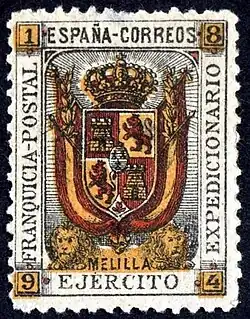 In 1893–94, Spain was engaged in the Margallo War, centred around the Spanish enclave of Melilla in North Africa which came under attack by local tribesmen. In 1893, Torres approached the Melilla garrison commander with an offer of free stamps and stationery for the soldiers, which the commander accepted without reference to the Spanish postal authorities.[28] Torres produced 51 different types of stamp which were supplied to the soldiers who applied them to the envelopes and used them to write home,[28] despite their mail already being free of charge. Their letters served to legitimise the stamps and give them value in the philatelic market.[29] In addition, Torres produced extra mail pieces which were sent to his friends and associates and retained many stamps for sale to collectors.[28]