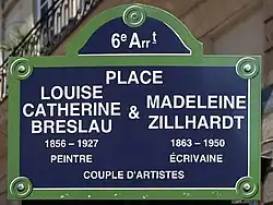 The place is named in memory of German painter Louise Catherine Breslau and French writer Madeleine Zillhardt, by vote of the Council of Paris.[1]