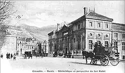 - N°9: musée-bibliothèque de Grenoble: the building, which housed the municipal library until 1970 and the museum collections until 1993, was designed by the architect Questel in a neo-Renaissance style. It was inaugurated in 1872 after several years of work interrupted by the Franco-German war of 1870. The main facade, on the Place de Verdun, is decorated with six sculptures protected in niches and created by the Grenoble sculptor Henri Blanc-Fontaine. These represent on the left side the allegories of Painting, Architecture and Sculpture and on the right side, the allegories of Poetry, Science and History.[10]