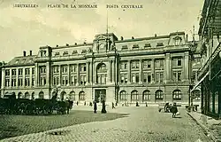 On the western side of the square, a new mint, built in 1649, then rebuilt and extended in 1755, gave way in 1820 to another mint designed in neoclassical style by the architect Charles Vander Straeten. Demolished in 1881–1886, it was in turn replaced in 1892 by the Grand Central Post Office (French: Poste centrale, Dutch: Hoofdpostkantoor), officially the Hôtel des Postes et Télégraphes, an imposing eclectic building by the architect Louis De Curte.[10]