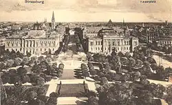 The Place de la République was designed by architect Jean-Geoffroy Conrath (1824–1892) during the Reichsland period as the conspicuous and grandiose entrance of the Neustadt opposite the ancient Grande Île city center on the other side of the Ill. The layout and construction of the square began in 1880.[1] It was then called Kaiserplatz ("Imperial Square" or "Emperor Square").[3] Ginkgo biloba trees, which were presented by Emperor Meiji of Japan to his German counterpart (either Wilhelm I or Wilhelm II, depending on the source), were planted in the central garden in the 1880s; those trees still stand today.[4][5] Conversely, a purple beech and a fern-leaf beech, planted between 1883 and 1887, were felled by a storm in the night of the 19–20 June 2019.[6]
