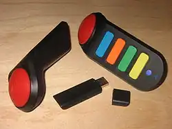 The Buzz! Buzzer is a special controller designed specifically for the Buzz! quiz game series. The controllers feature large red buzzer buttons and four smaller coloured buttons for answer selection. Both wired[6] and wireless[7] versions are available and come bundled with Buzz! games. A four-buzzer set acts as a single USB device and connects a USB port on the PlayStation 2. Wireless versions connect via a USB dongle, with each dongle able to support up to 4 wireless buzzers at a time. A second dongle is required for additional buzzers (for 8 player games). Both the wired and wireless versions of the buzzers are compatible with both PlayStation 2 and PlayStation 3. The "big button controllers" available for the Xbox 360 heavily resemble buzzers in many respects, and fulfil the same function.