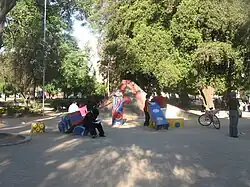 The children's play equipment in the center of the square was inaugurated in 1993 and consists of 22 play sculptures created by the artist Fédérica Matta. They represent various cultural and geographic symbols of Chilean identity.[3]