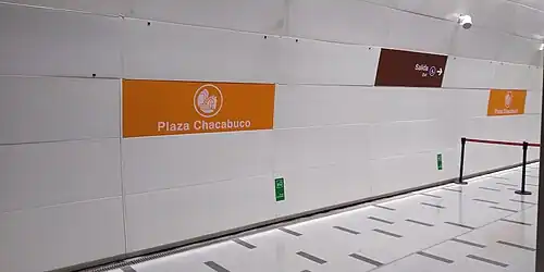 Plaza Chacabuco is an underground metro station of Line 3 of the Santiago Metro network, in Santiago, Chile. It is an underground, between the Conchalí and Hospitales stations on Line 3. It is located at the intersection of Independencia Avenue with Hipódromo Chile. The station was opened on 22 January 2019 as part of the inaugural section of the line, from Los Libertadores to Fernando Castillo Velasco.[3]
