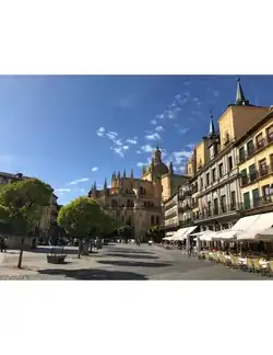 Plaza Mayor is a town square in Segovia, Spain, located at the end of the street called Calle Real, which is one of the most famous streets in Segovia. Within Plaza Mayor, you can find several important buildings, such as the town hall, the Juan Bravo Theatre, the San Miguel Church, and the cathedral.