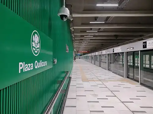 Plaza Quilicura is an underground metro station and the northern terminal station of Line 3 of the Santiago Metro network, in Santiago, Chile. It is an underground, preceded by Lo Cruzat station on Line 3. It is located at the intersection of Manuel Antonio Matta Avenue with Bernardo O'Higgins Avenues.