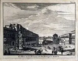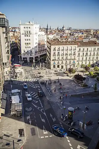 Located in the northern end of the city by the 16th century, near the Walls of Philip II, the square became a key point for the traffic arriving to Madrid from El Pardo or from Fuencarral.[2] The huge convent of Santo Domingo covered an area going along the cuesta de Santo Domingo, extending from the plaza de Santo Domingo to the plaza de Isabel II.[3] The square gained its current size after the demolition of the convent during the 19th-century ecclesiastical confiscations.[4]