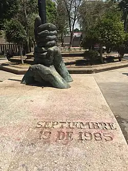 ![]() Monument in the plaza honoring the victims and rescuers of the 1985 Mexico earthquake, appreciated in 2022 | |