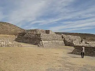 The structure has rather rare elements in Guanajuato. The architectonic layout is T-shaped and unfortunately was found in bad conditions; apparently was destroyed towards its decline (900 CE). The profile of its perimeter wall also has the northern structure monolithic stones and among the remains are large engraved stones depicting cut spirals that most have been part of the structure. Inside are traces of a wall that possibly divided the space, covered with a clay floor, probably remains of two small patios.[3]