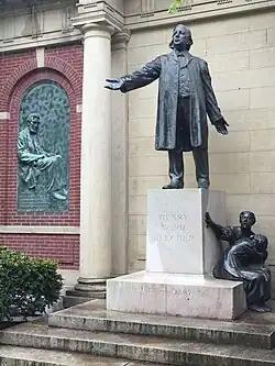 The church garden, fronting on Orange Street and located between the Church House and the Sanctuary, contains a statue of Beecher and a bas-relief of Lincoln. Both were produced by famed sculptor Gutzon Borglum, who later created the Mount Rushmore National Memorial.[1][2] An almost identical statue of Beecher is located less than a mile away, next to Cadman Plaza, in front of Brooklyn's historic Federal Building and Post Office.[57]