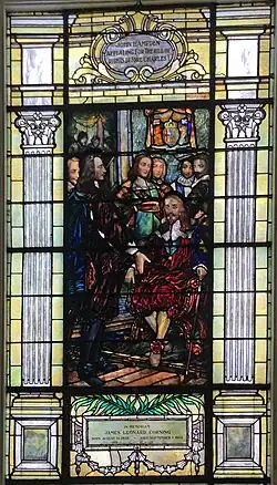 In 1907–09, the church installed stained-glass windows by the noted J&R Lamb Studios.[50][51] This studio opened it doors in 1857 and is now the oldest existing studio of its kind in the US.[52][53] The windows in Plymouth Church are unique in that they do not depict any biblical scenes. Instead they focus on the history of democracy in England and the US, with a particular emphasis on the influence of the Puritans, Pilgrims and Congregational Churches.[54][55] In 1913 the family of John Arbuckle,[56] a coffee merchant, donated money to create a large garden and the Classic revival parish house. The house and arcade which adjoin the building were designed by Woodruff Leeming.[1][2]