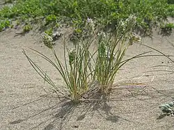 Poa douglasii is a species of grass known by the common names Douglas' bluegrass and sand dune bluegrass. It is endemic to the coastline of California, where it grows in shifting sand dunes. It can be found mostly along the Central Coast and Channel Islands, and occasionally on the North Coast north of Mendocino. It is a perennial grass growing small, dense clumps up to about 30 centimeters in maximum height. It grows from a network of long rhizomes and stolons that anchor the grass to its loose sandy substrate; this network may be up to one meter long.[1] The inflorescence is a dense, oval-shaped series of overlapping spikelets. The grass is dioecious, with male and female individuals producing different types of flowers in their inflorescences.[2] This species, like many sand-dune endemic plants, is threatened by invasive species.