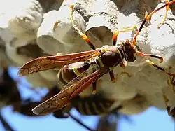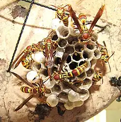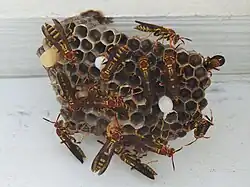 13. ^ a b Reed, Hal C.; Vinson, S. B. (1979). "Nesting Ecology of Paper Wasps (Polistes) in a Texas Urban Area (Hymenoptera: Vespidae)". Journal of the Kansas Entomological Society. 52 (4): 673–689. JSTOR 25083981.
