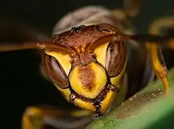 Polistes exclamans exhibit an alarm response, typical of many higher level eusocial Hymenoptera.[33] Although it has been previously indicated that nest mates may alarm the rest of the nest through jerky movement and buzzing of wings, P. exclamans is capable of alarming the rest of the nest and attracting attacking wasps through chemical means by releasing a non-species-specific venomous alarm pheromone.[33] Although a chemical signal to warn against attack would be evolutionarily adaptive, the P. exclamans only releases a response after the initial attack from and on the predator, as the venom is only released during the sting.[33] This venom is capable of warning and coordinating a response from the nest and attracting nearby heterospecific or conspecific females from nearby colonies to attack the predator.[33] This helps deter the predator from further attacking and is especially adaptive for the defense of the nest. Although certain other insects have been able to adapt the release of the pheromone to other means of communicating alarm, P. exclamans has yet to do so, indicating that it is still in its “primitive state in evolution of the complex systems of communication of alarm seen in higher social insects.”[33] In one experiment, pheromones were extracted from female glands and sacs and were spread onto venom paper. It was then found that females were attracted upwind of the venom paper and some even attempted to sting it. This also had a heterospecific response where others also reacted to it. While it was found that one wasp couldn't release enough pheromones to elicit a response, if many individuals were alarmed they would elicit a response from the rest of the nest. However, this scent is not strong enough to reach other nests, and so neighboring nests must be alarmed by physical movements and wing flapping.[33]