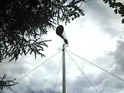 "The Horn" is a 24-metre (79 ft) high sculpture, located at the north-east corner of the country park, beside the M8 motorway. The stainless steel sculpture was commissioned by West Lothian Council, and was designed by artists Matthew Dalziel and Louise Scullion.[8] It was inaugurated on 21 November 1997 by Magnus Linklater, then chairman of the Scottish Arts Council. On windy days, the horn plays recorded music, poetry and famous quotes. The Horn could be classed as a speaker in itself, inside the bottom contains two 1990s Yamaha AX-596 Stereo Amplifiers which are connected to a device that automatically plays the content.