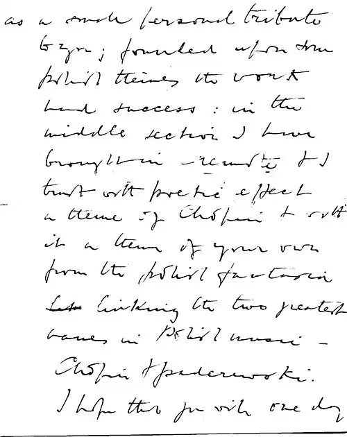 For the Polish Concert in July I composed an orchestra piece 'Polonia' as a small personal tribute to you; founded upon some Polish themes the work had success: in the middle section I have brought in remote & I trust with poetic effect a theme of Chopin & with it a theme of your own from the Polish Fantasia linking the two greatest names in Polish music – Chopin & Paderewski. I hope that you will one day hear the piece &, it may be, approve.