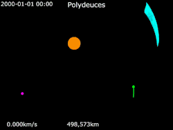 Polydeuces has a slightly elliptical orbit with an eccentricity of 0.019, which is unusually higher than Dione's eccentricity of 0.002. While Dione's eccentricity is known to result from its 1:2 mean-motion orbital resonance with Enceladus, the effects of this resonance are too weak to explain Polydeuces's relatively high eccentricity.[4]: 233  One possible explanation is that Polydeuces always had an eccentric orbit since its formation because its orbit did not change much over billions of years.[4]: 233