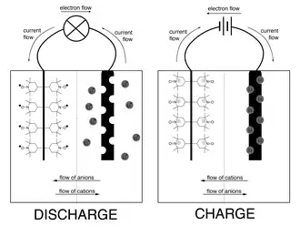 To charge a polymer-based battery, a current is applied to oxidize the positive electrode and reduce the negative electrode. The electrolyte salt compensates the charges formed. The limiting factors upon charging a polymer-based battery differ from metal-based batteries and include the full oxidation of the cathode organic, full reduction of the anode organic, or consumption of the electrolyte.[3]
