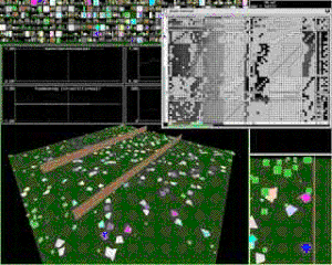 It uses the Qt graphics toolkit and OpenGL to display a graphical environment in which a population of trapezoid agents search for food, mate, have offspring, and prey on each other. The population is typically only in the hundreds, as each individual is rather complex and the environment consumes considerable computer resources. The graphical environment is necessary since the individuals actually move around the 2-D plane and must be able to "see." Since some basic abilities, like eating carcasses or randomly generated food, seeing other individuals, mating or fighting with them, etc., are possible, a number of interesting behaviours have been observed to spontaneously arise after prolonged evolution, such as cannibalism, predators and prey, and mimicry.