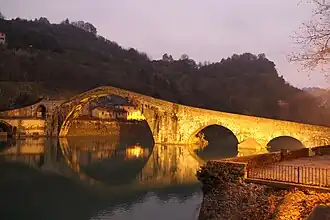 Ponte della Maddalena is a bridge crossing the Serchio river near the town of Borgo a Mozzano in the Italian province of Lucca. It's one of numerous medieval bridges known as Ponte del Diavolo, the "Bridge of the Devil", it was a vital river crossing on the Via Francigena, an early medieval road to Rome for those coming from France that was an important medieval pilgrimage route.