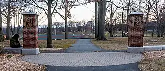 The Olmsted Brothers completed the park in 1903, which was the year of Frederick Law Olmsted's death; his son and nephew completed the work.[3] Originally the park's western boundary was defined by the Park River, which was straightened and diverted underground beneath the park in the 1940s.[3] The park consisted of 90.5 acres (36.6 ha) laid out in three sections:[4]