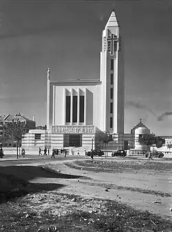 In 1933, he designed the Church of Our Lady of Fátima in Lisbon, for which he received the 1938 Valmor Prize. Despite the Catholic Church’s support, the building's modernity would be challenged by the more conservative sectors of Portuguese society. For this project, he enlisted the collaboration of a group of nine artists, including Francisco Franco, Almada Negreiros, and Lino António. In 1934, he began projects for the Alcântara Maritime Terminal and the Rocha do Conde de Óbidos Terminal, completed in 1943 and 1948, where he again collaborated with Negreiros. In 1936 he participated in the 13th International Congress of Architects in Rome, where he sought out ideas from similar ocean liner terminals in other countries, including those at Cherbourg and Le Havre in France, Genoa and Trieste in Italy, and some in the United States, including Los Angeles. In 1936, he took office as president of the National Union of Architects (until 1944); and in 1937, he travelled to Algeria and Italy with Pacheco and then to Paris, where he attended the Exposition Internationale des Arts et Techniques dans la Vie Moderne.[4][6][2][7]