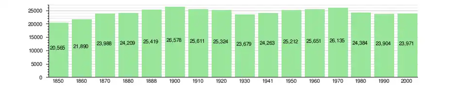 Porrentruy has a population (as of December 2020) of 24,276.[1] Most of the population (as of 2000) speaks French (22,008 or 91.8%) as their first language, German is the second most common (1,001 or 4.2%) and Italian is the third (306 or 1.3%). There are 8 people who speak Romansh.[4]