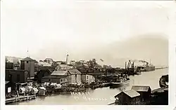 In time Port Burwell became a shipbuilding and fishery harbour and the export point for lumber and farm produce from the surrounding townships and a large portion of Oxford County, boosted by construction of roads and railway lines.[8] One of these, the Tillsonburg, Lake Erie & Pacific Railway, formed by a group of Tillsonburg businessmen, recognized the harbour's potential to receive coal from Pennsylvania for use in Oxford County and elsewhere, and pushed for a railway car ferry service across Lake Erie. Port Burwell's harbour was improved for this purpose in 1903, the Ashtabula railcar ferry began operating between Ashtabula, Ohio and Port Burwell to haul coal, and the rail line was built north through Vienna and Tillsonburg to Ingersoll by 1903, and to Embro by 1908 (plans to continue on to Stratford and Collingwood were scrapped).[9] The line was eventually leased to the Canadian Pacific Railway to anchor the coal business, and the Ashtabula served Port Burwell bringing coal across the lake for half a century.