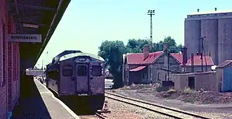 The wooden station building was opened in 1876 at the terminus of the lightly engineered, 1067 mm (3 ft 6 in) gauge railway from Port Pirie – then a town of fewer than 1,000 people – into the rich agricultural hinterland of the Mid North. The need was to transport agricultural produce more cheaply to the port for export, mainly to Great Britain, in sailing ships.[1]: 27  The following year, Port Pirie's inaugural railway station was opened. A modest weatherboard building, it was placed at the north end of the railway yards, about 250 metres (270 yards) from the town's wharves.[2] In addition to the building there were two locomotive sheds and a freight shed, coaling and watering facilities, a passing loop in front of the station building, and a few sidings.