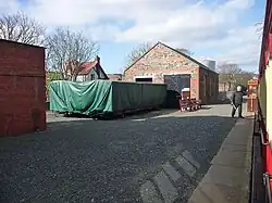 Of the same construction as the shed at Castletown Station and built at the same time by local builders, the goods shed here is located on the south western side of the station building and features rail connected doors at either end as well as platform height openings at the elevations and rear; it also boasts an external loading platform and originally had associated awnings, lost in more recent times. It is constructed from local rubble stone and features red brick quoins throughout with three large windows on the railway-side; as built a large skylight was also featured on the rear roof panel. For a time it was leased by Campamarina (as above), and the northern doorway was for a time bricked up and rendered, with only a small doorway in this section for access. It is commonly used for storage only and from 2020 was used for the decontamination of asbestos from the railway's non-service locomotives; in 2022 it became home to locomotive No.5 Mona which was cosmetically restored by volunteers of the Isle of Man Steam Railway Supporters' Association. Internally the goods shed is rail accessible and half its floorspace is at platform height; the second set of doors are accompanied by a short spur which allows onward transit of goods from road vehicles.