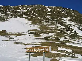 Port de la Bonaigua (el. 2072 m., 6,798 ft) is a mountain pass in the Pyrenees in Catalonia, Spain. It connects Esterri d'Àneu in the comarca of Pallars Sobirà with Vielha e Mijaran in the comarca of Aran. The Baqueira-Beret ski resort is located at the top of the pass.