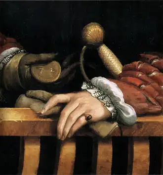 The left hand lies on the chair's armrest: it has a golden ring with a stone on the little finger, and holds a glove, near the sword's hilt. The other hand is wearing a glove, and shows a bronze medal with two symbols. These symbols have been interpreted as a "C" and an "F", hinting at the title of Comes Fontanellati ("Count of Fontanellato"), or as a "72" (based on earlier inventories). The meaning of the number is subject to several speculations. It has been connected to alchemy, an allusion to the Moon and Jupiter or to the conjunction of the Sun and Moon, referring in turn to the marriage of Galeazzo and his wife Paola Gonzaga. There is no historical record that Sanvitale practiced alchemy: although Parmigiano likely did, art historians have found no reason he should insert coded elements into a portrait.[1]