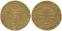 Commissioned by King Manuel of Portugal to commemorate the Portuguese Empire and Discoveries, it was first minted shortly before the voyage of Vasco da Gama, who carried some in his expedition to India in 1497.[2] It weighed 35 grams and was worth 10 gold cruzados or ducats.[3] On the obverse it featured the coat-of-arms of Portugal, around which a Latin rendering of the Portuguese royal title was inscribed, and on the reverse the cross of the Order of Christ and the Latin inscription In Hoc Signo Vinces ("By This Sign You Shall Triumph"). It was intended as a symbol of prestige and to be used in large commercial transactions rather than everyday use, particularly for the purchase of spices in Asia, and remained in issue throughout the reign of Manuel's son and successor, John III, but it was discontinued in 1555.[4] Approximately 400,000 golden Portuguese are estimated to have been struck between 1500 and 1538, equivalent to 14.2 tons in gold.[5]