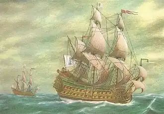In 1716, she had a complement of 700 men.[2] She had a length of 67 metres (219 ft 10 in) and a beam of 16.5 metres (54 ft 2 in).[2]