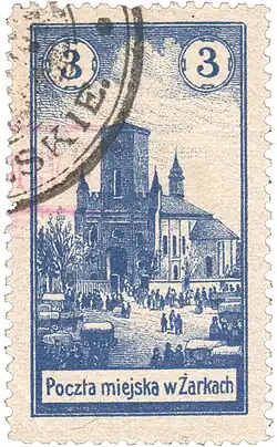 A local postal service briefly operated in the Polish town of Żarki during the month of October 1918. Postage stamps were issued, in one design but in three denominations denoted by different colouring. A set of forgeries was made in 1928. The stamps, both genuine and forged, have attracted philatelic attention.