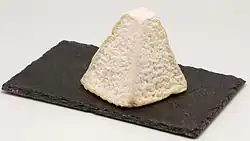 The cheese is distinctive, being pyramidal in shape and golden brown in colour with speckles of grey-blue mould, and is often known by the nicknames "Eiffel Tower" or "Pyramid". It has a square base 6.5 cm wide, is around 9 cm high, and weighs 250 grams (8.8 oz).[1] The central pâte is bright white with a smooth, crumbly texture that mixes an initial sour taste with salty and sweet overtones. The exterior has a musty odour reminiscent of hay.