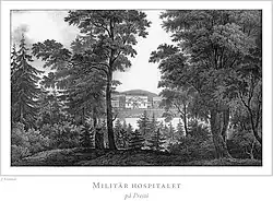 As the Åland Islands became a part of the Russian Empire in 1809, the islands were soon occupied by Russian military. A military hospital was established in Prästö in the early 1810s. As the construction of the Bomarsund Fortress started in 1829, the hospital was soon surrounded by several other buildings, forming a small village. The hospital operated until the fall of the Bomarsund Fortress in 1854, and was then burned down together with the nearby houses.[2]