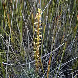 Pauline's leek orchid grows with grasses and sedges in swamps near Albany in the Jarrah Forest biogeographic region.[3][4][5]