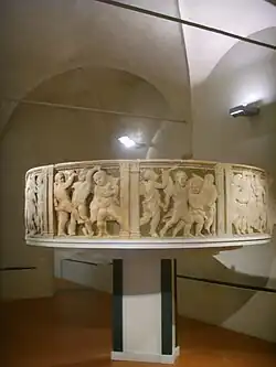 - the parapet of the external pulpit of the cathedral (1434–1438), made by Donatello and his school. Because of the degradation suffered during their five centuries outside, the reliefs were removed from the pulpit in 1967 and were substituted with replicas. A laborious restoration and cleaning (finished in 1999) directed by the Opificio delle pietre dure of Florence recreated a more unified and legible work. The imposing parapet takes the form of a small round temple with double pilasters that divide it into seven carved sections, each displaying a group of dancing figures which seem to move with joyous and vivacious steps.