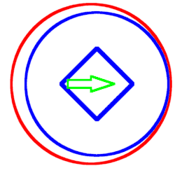 Mechanical precession is the process of a round part (in blue) in a round hole (in red) rolling in the direction opposite to the rotational direction of the applied radial force. (The applied radial force is depicted by the green arrow. The arrow's counterclockwise rotation depicts the direction of precession, while the direction of rotation is shown by the clockwise rotation of the blue square. The center of the blue square is traversing counterclockwise along a small circle, the orbit, of diameter equal to the difference of the diameters of the red circle and the blue circle, even though the blue square rotates clockwise). If the blue circle has a diameter and the red circle a diameter d + δ.  The instant the green arrow is pointing downwards, the blue circle is pressed against the red circle at the bottom (point A on the blue circle). The force rotating counterclockwise causes the blue circle to roll around the red circle clockwise. When it has rolled a distance πd, the circumference of the blue circle, point A again touches the red circle. Since the circumference of the red circle is π(d + δ), point A touches the red circle a distance πδ  clockwise from the bottom.