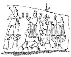 A drawing of rock-carved reliefs of a procession of Hittite deities in Yazılıkaya, Turkey.